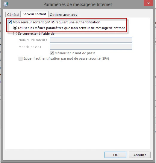 cocher Mon serveur sortant (SMTP) requiert une authentification et cocher Utiliser les mêmes paramètres que mon serveur de courrier entrant