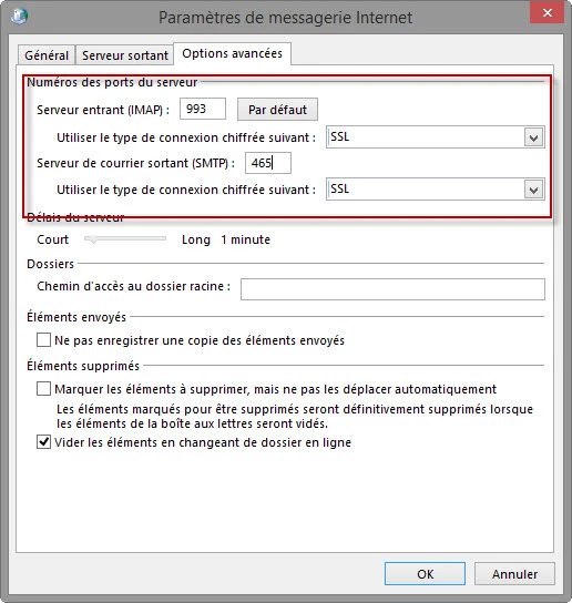 - Utiliser le type de connexion chiffrée suivant : SSL