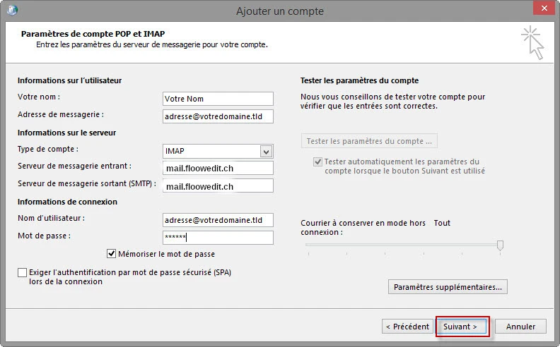 Remplir les informations nécessaires, choisir le Type de compte IMAP et cliquer Paramètres supplémentaires…