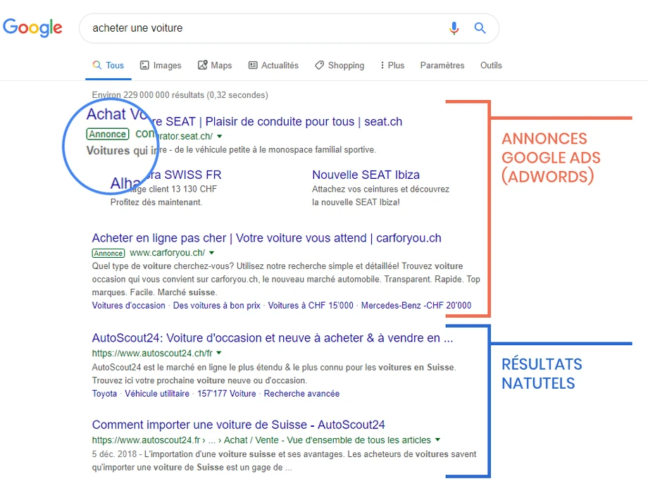 Dans les résultats Google vous allez trouver deux catégories de résultats:
